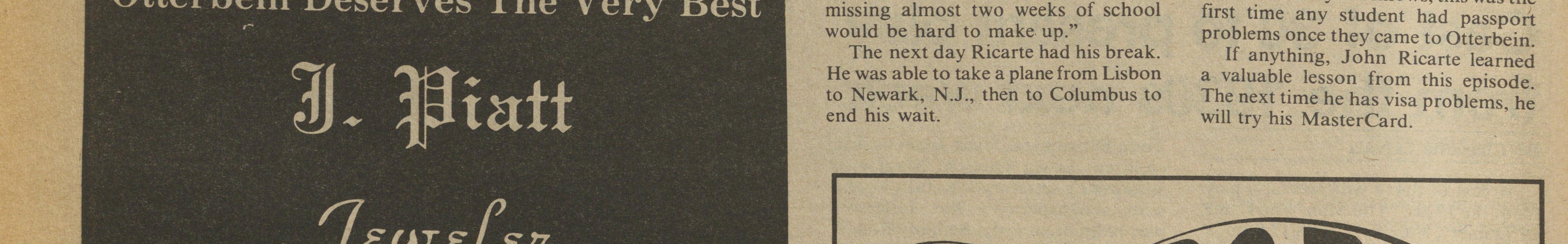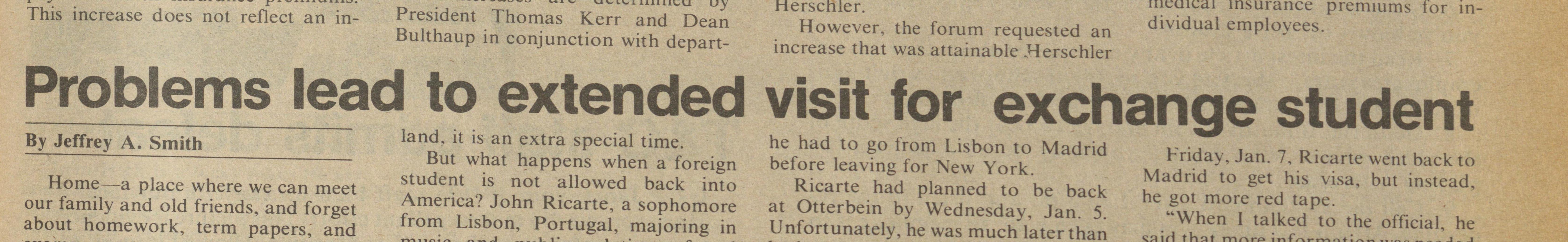 Home - a place where we can meet student is not allowed back into Ricarte had planned to be back Madrid to get his visa. but instead. our family and old friends, and forget America? John Ricarte, a sophomore he got more red tape. at Otterbein by Wednesday, Jan. 5. about homework, term papers, and from Lisbon, Portugal, majoring in exams. music and