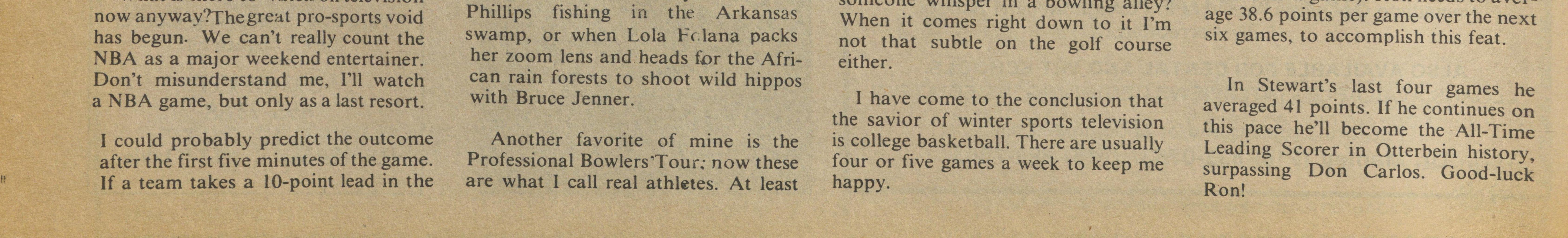 What is there to watch on television now anyway?Thegreat pro-sports void has begun. We can't really count the NBA as a major weekend entertainer. Don't misunderstand me, I'll watch a NBA game, but only as a last resort.