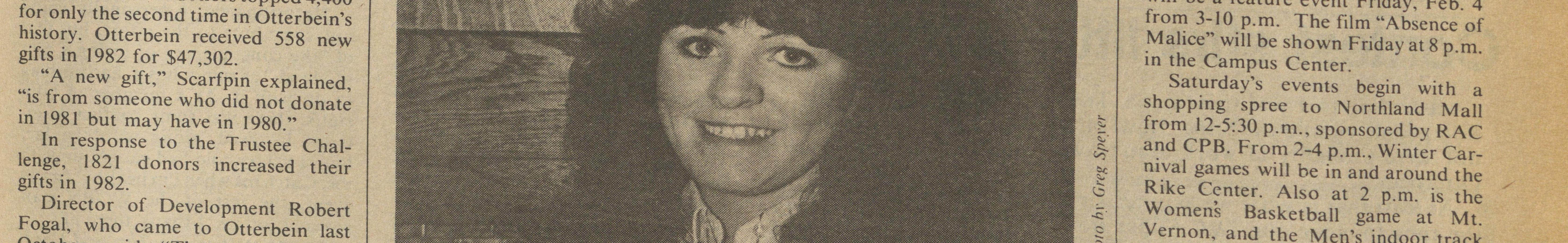 Carnival Fun continues 1982 was the $100,000 "Trustee Chal Carr, foreign student advisor, filled And wait he would. The next morn through Saturday night lenge" to the Otterbein Fund, the out all the forms needed to get a proper ing happened to be the Epiphany annual campaign to generate unre visa, supposedly good until 1985. stricted gifts for the college. The fund This winter break marked the first holiday in Madrid, so the embassy was By Amy Cedargren closed. Ricarte went back to his home helps bridge the gap between tuition time Ricarte had been home since coming to the United States 16 months in Lisbon. "Boy, was my mother Winter Carnival Week, Feb. 2-6, and the real cost of education. Scarf surprised," said Ricarte. began with the coronation of the pin stated the fund gained $588,409 in ago. To get back to the United States, Winter Carnival Queen during half 1982, a 58 percent increase over 1981 and an all-time high. time of the Otterbein-Capital basketball game Wednesday in the Rike In the Trustee Challenge, board