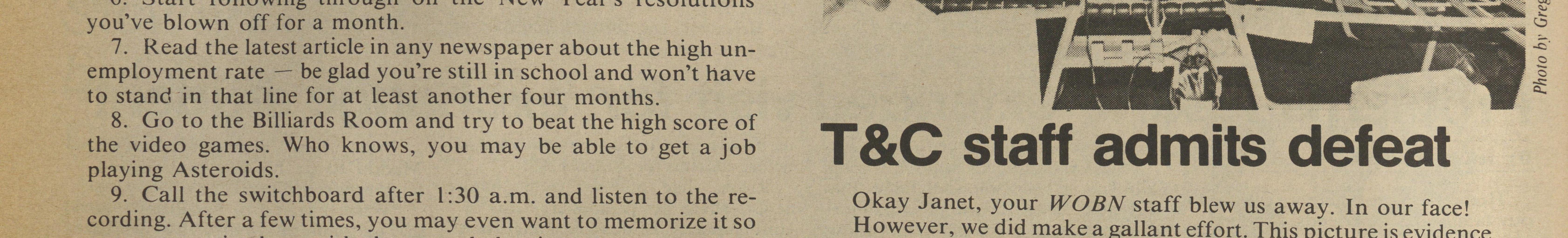 The middle of winte: term. The T &C staff, along with the majority of the campus, considers this time one of the worst as far as enthusiasm. So, for this reason, we have devised ten ways to overcome the middle-of-the-winter-term yucks!