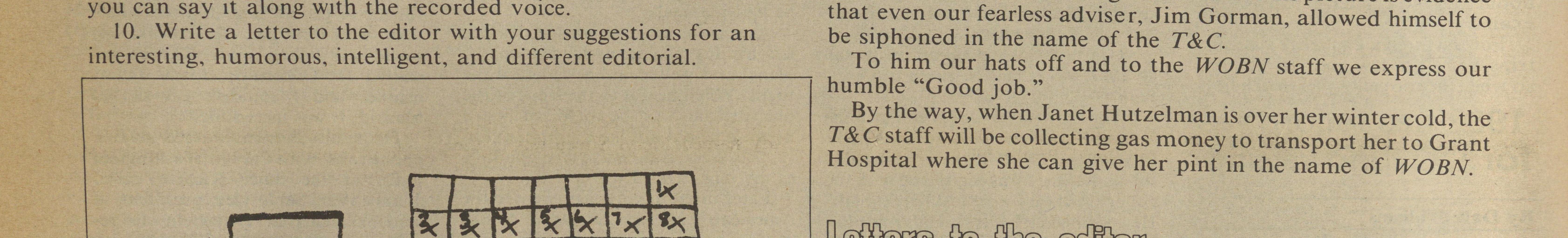 On behalf of the staff of WOBN, I is granted, along with a wish for "better luck next time ," perhaps in a would like to respond to the somewhat challenge game of basketball. pungent (bordering on libelous) editorial, which appeared in last