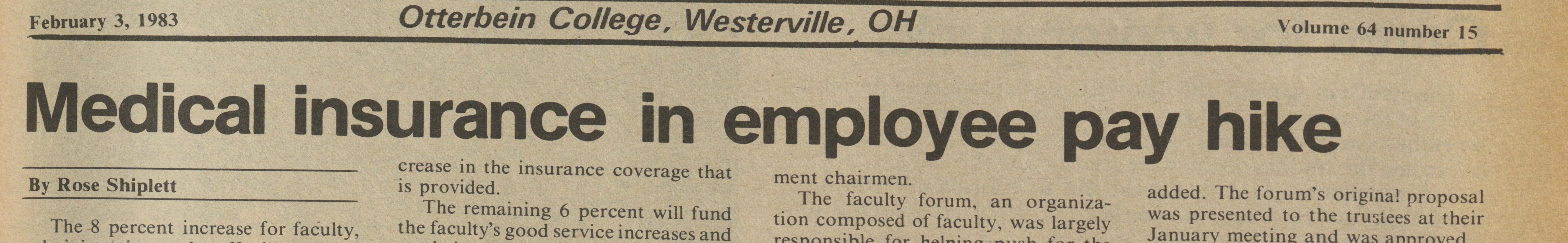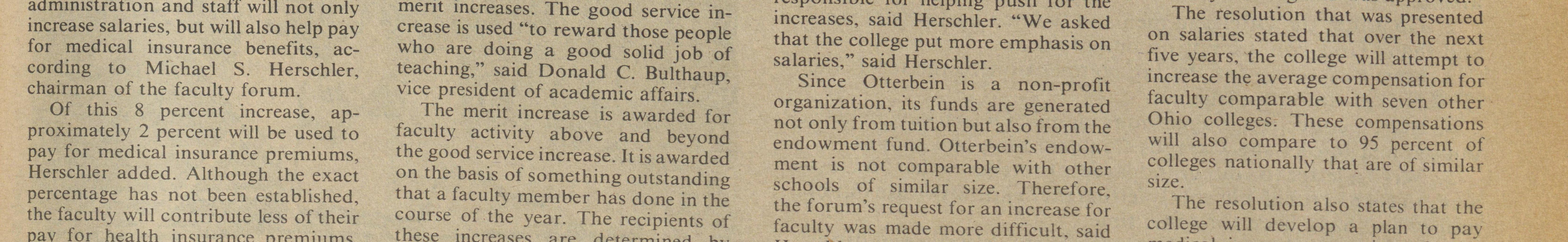 The 8 percent increase for faculty, the faculty's good service increases and tion composed of faculty, was largely was presented to the tru!.tees at their administration and staff will not only merit increases. The good service in responsible for helping push for the January meeting and was approved. increase salaries, but will also help pay increases, said Herschler. "We asked The resolution that was presented crease is used "to reward those people for medical insurance benefits, ac who are doing a good solid job of that the college put more emphasis on on salaries stated that over the next cording to Michael S. Herschler, teaching," said Donald C. Bulthaup, salaries," said Herschler. five years. the college will attempt to chairman of the faculty forum. vice president of academic affairs. Since Otterbein is a non-profit increase the average compensation for Of this 8 percent increase, ap The merit increase is awarded for organization, its funds are generated faculty comparable with seven other proximately 2 percent will be used to faculty activity above and beyond not only from tuition but also from the Ohio colleges. These compensations pay for medical insurance premiums, the good service increase. It is awarded endowment fund. Otterbein's endow will also compare to 95 percent of Herschler added. Although the exact ment is not comparable with other colleges nationally that are of similar on the basis of something outstanding percentage has not been established, that a faculty member has done in the schools of similar size. Therefore. size. the faculty will contribute less of their the forum's request for an increase for The resolution also states that the course of the year. The recipients of pay for health insurance premiums. these increases are determined by faculty was made more difficult. said college will develop a plan to pay This increase does not reflect an in- President Thomas Kerr and Dean Herschler. medical insurance premiums for inBulthaup in conjunction with depart- However, the forum requested an dividual employees. increase that was attainable Herschler