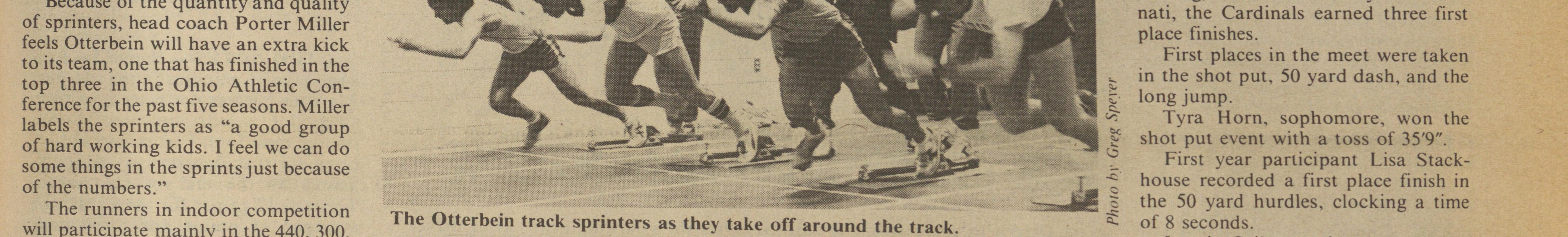 The Cardinals again showed their Union, Baldwin-Wallace, and Otterteam strength by placing first in seven bein, the three schools vying for the Shot putters Eric Anderson and Jon of the 16 events. Marietta and Witten conference_chamoionshios in March. Divine paced the Cardinals in last berg were the Cardinals closest com Coach Porter Miller said the faFriday night's home meet with Bald petition as each took three first places. vored team in the O.W.U. Relays win-Wallace, Wittenberg, Marietta, First place finishes by Otterbein would be 1982 Indoor Conference and Capital. were: 4 Lap Relay: I: 16.4; Shot Put: Champions Mount Union. Miller gave Anderson and Divine, both juniors, Anderson 48'¼"; Mile: Todd Corwin the Purple Raiders the nod from early paced the Otters to a first and second 4:27.2; 50 Yd. High Hurdles: Mark season results. place finish in the shot put event. Robinson 7.1; Pole Vault: Scott Dun Tuesday, several runners were ques Anderson's put of 48'¼" is the longest can 13'6"; 880 Yd. Run: Kevin Cham tionable participants in this week's toss in the conference so far in the '83 bers 2:04.9; Mile Relay: 3:42.6. meet. Senior Tim Bland was recuper indoor season; Divine's toss of 47'8½" The Otters will compete in the ating from a strained hamstring, Anawarded him second place. Both O.W.U. Relays this Saturday in their derson in his first place performance Anderson and Divine are now quali first away meet of the season at Dela last week suffered a shoulder injury, The Otterbein Indoor Track Team in fied for the Indoor and Outdoor Track ware, Ohio. The meet will feature, for and several Cardinal runners were action as they p!accd first in seven of Championships. the first time this season, Mount reported as having the flu. 16 events at last Friday night's home meet.