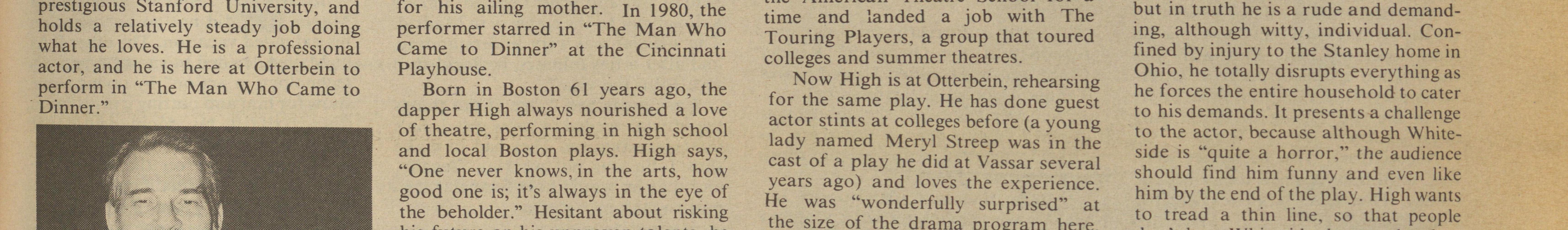 John High is a lucky man. He attended the oldest boys' prep school in America, majored in math at the prestigious Stanford University, and holds a relatively steady job doing what he loves. He is a professional actor, and he is here at Otterbein to perform in "The Man Who Came to Dinner."