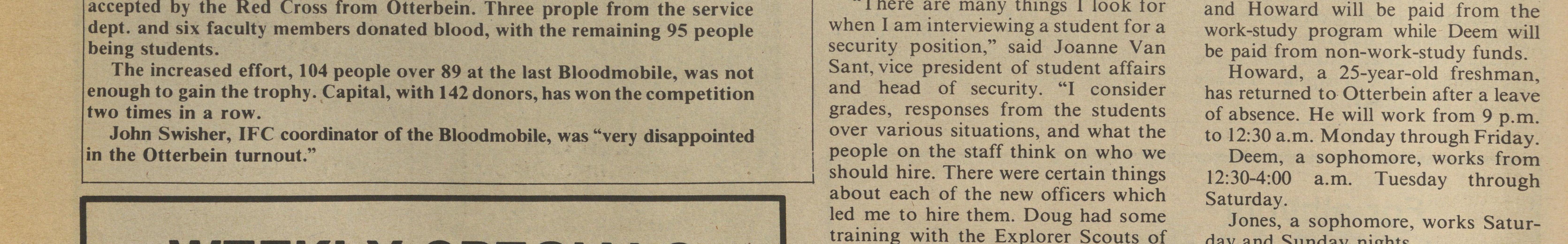 The salary for the sec urit y job s is slightly over minimum wage Jones and Howard will be paid from the work-study program while Deem will be paid from non-work-study funds. Howard, a 25-year-old freshman , has returned to Otterbein after a leave of absence. He will work from 9 p.m. to 12:30 a.m. Monday through Friday. Deem, a sophomore, works from 12:30-4:00 a.m. Tuesday through Saturday.