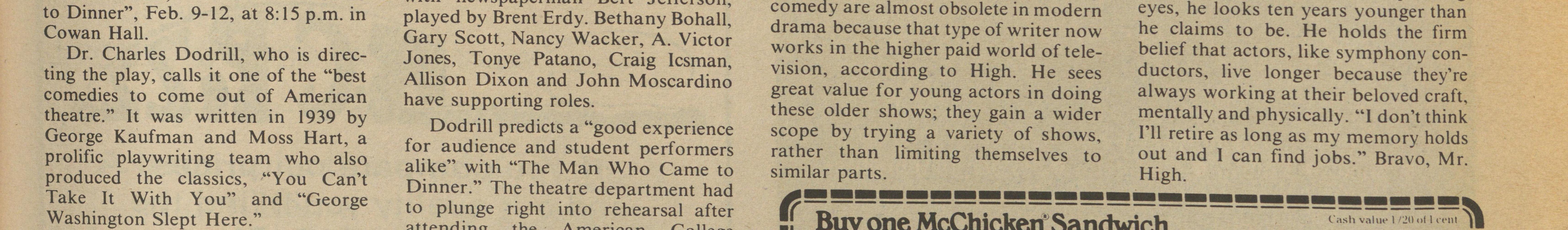 Dodrill predicts a "good experience for audience and student performers alike" with "The Man Who Came to Dinner." The theatre department had to plunge right into rehearsal after attending the American College Theatre Festival, but preparations are proceeding smoothly.