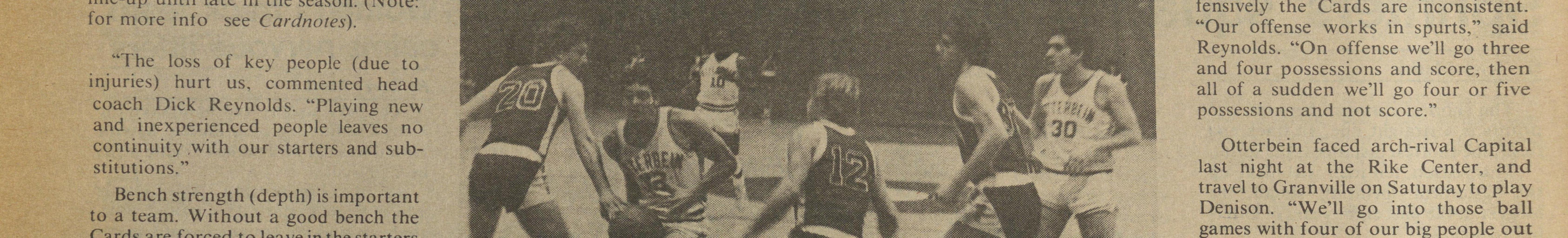 Otterbein faced a r ch-r ival Capital last night at the Rike Center , and travel to Granville on Saturday to play Denison. "We'll go into those ball games with -four of our bi g people out of the line-up," concluded Reynolds.