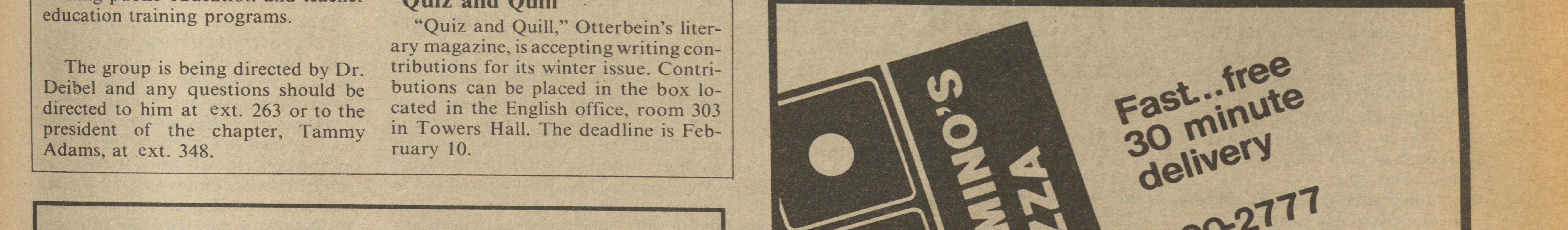 "Quiz and Quill ," Otterbein's literary magazine, is accepting writing contributions for its winter issue. Contributions can be placed in the box located in the English office , room 303 in Towers Hall. The deadline is February 10.