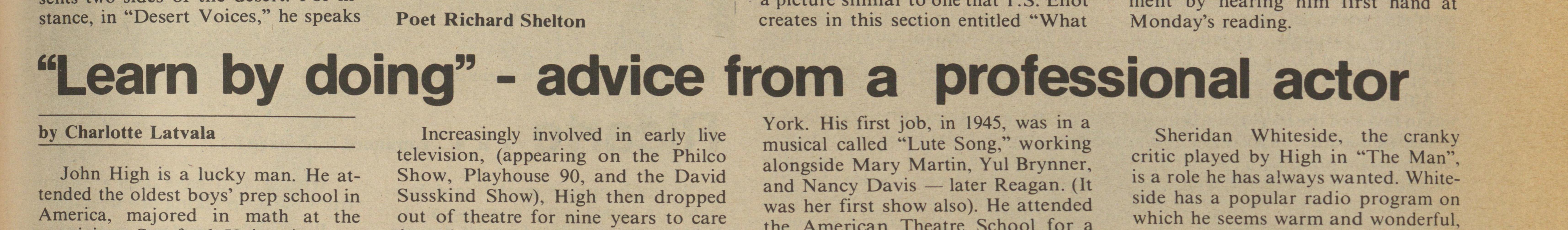 Born in Boston 61 years ago, the dapper High always nourished a love of theatre, performing in high school and local Boston plays. High says, "One never knows, in the arts, how good one is; it's always in the eye of the beholder." Hesitant about risking his future on his unproven talents, he ventured into the sensible study of mathematics, at which he excelled. High also wormed his way into 26 plays at Stanford. His studies and involvement with the college produc r tions were cut short by World War 11.