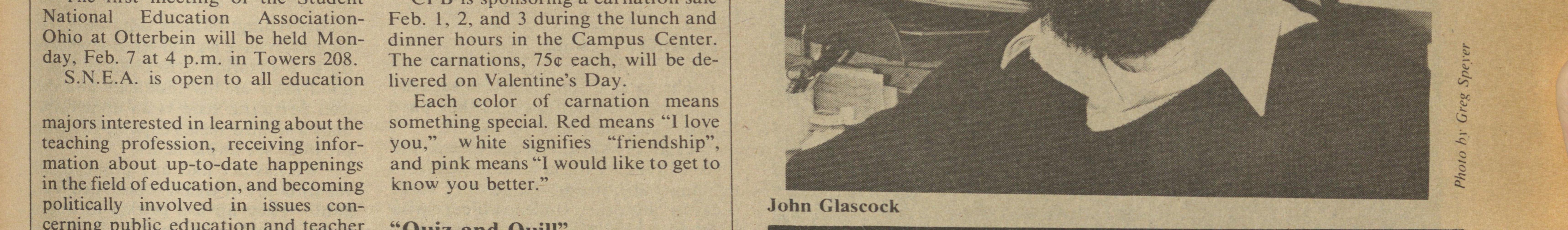 CPB is sponsoring a carnation sale Feb l, 2 , and 3 during the lunch and dinner hours in the Campus Center. The carnations, 75¢ each, will be delivered on Valentine's Day.