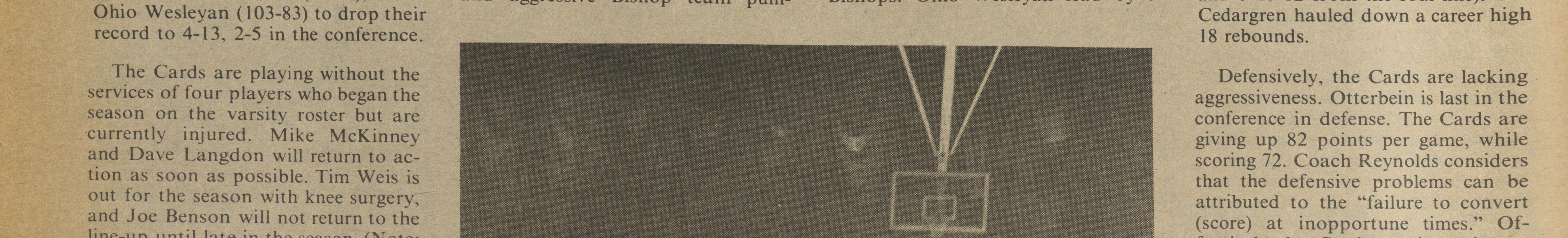 meled the Cards by twenty points; "Ohio Wesleyan has three sophomores that played together all last year on the varsity," said Reynolds. "They have a lot of talent, and they're the nucleus of their team."