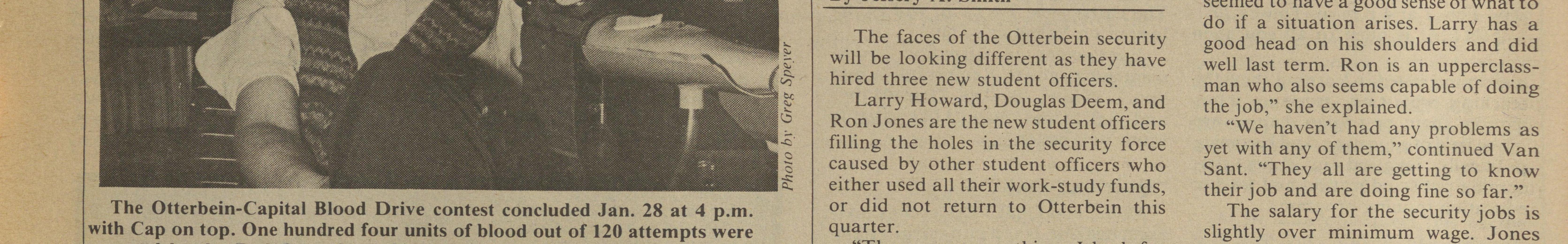 The Otterbein-Capital Blood Drive contest concluded Jan. 28 at 4 p.m. with Cap on top. One hundred four units of blood out of 120 attempts were accepted by the Red Cross from Otterbein. Three prople from the service dept. and six faculty members donated blood, with the remaining 95 people being students.