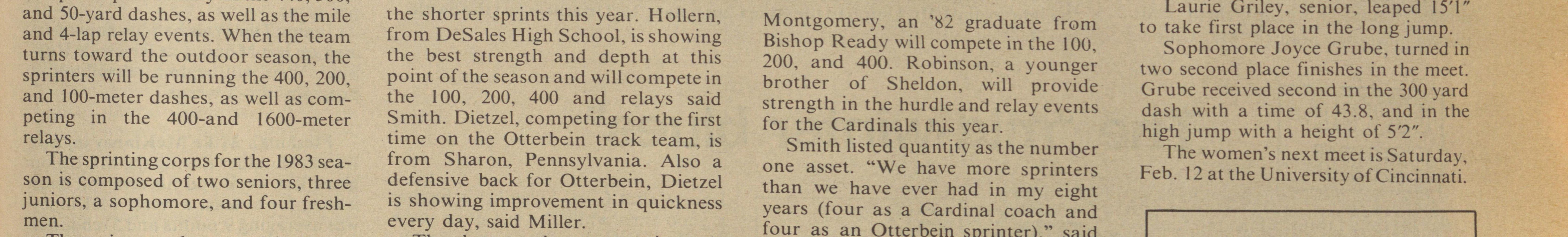 Laurie Griley, senior, leaped 15'1" and 50-yard dashes, as well as the mile the shorter sprints this year. Hollern, Montgomery, an '82 graduate from to take first place in the long jump. and 4-lap relay events When the team from DeSales High School, is showing Bishop Ready will compete in the IOU, Sophomore Joyce Grube, turned in turns toward the outdoor season, the the best strength and depth at this 200, and 400. Robinson, a younger two second place finishes in the meet. sprinters will be running the 400, 200, point of the season and will compete in brother of Sheldon, will provide Grube received second in the 300 yard and 100-meter dashes, as well as com the I 00, 200, 400 and relays said strength in the hurdle and relay events dash with a time of 43.8, and in the peting in the 400-and 1600-meter Smith. Dietzel, competing for the first for the Cardinals this year. high jump with a height of 5'2''. relays. time on the Otterbein track team, is Smith listed quantity as the number