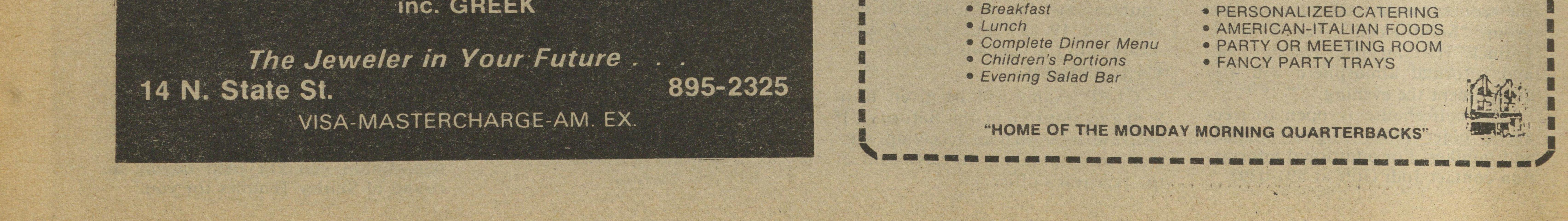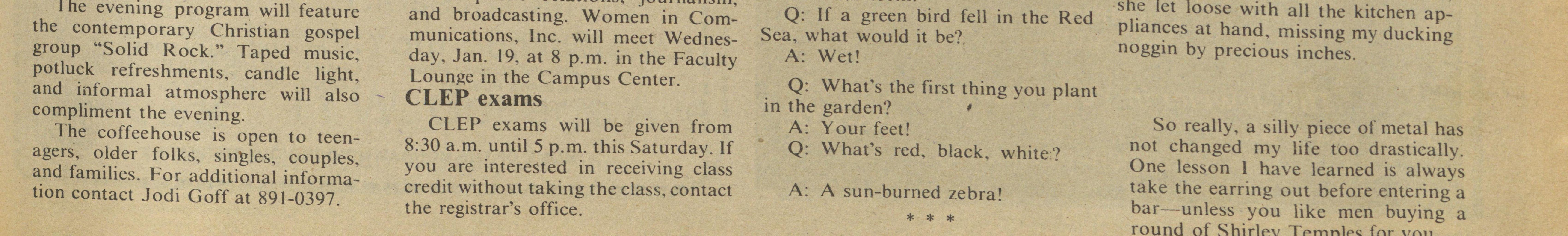 Q: What the best thing to put in a home during break, instead of Mom house" January 28, from 8 to 11 :30 greeting me with a lengthy rundown of Join the professionals in these pie? p.m. fields: public relations, journalism, A: Your teeth! how many homes she sold this month, The evening program will feature and broadcasting. Women in Com Q: If a green bird fell in the Red she let loose with all the kitchen ap the contemporary Christian gospel munications, Inc. will meet Wednes Sea, what would it be? pliances at hand, missing my ducking group "Solid Rock." Taped music, noggin by precious inches. day, Jan. 19, at 8 p.m. in the Faculty A: Wet! potluck refreshments, candle light, Lounge in the Campus Center. and informal atmosphere will also CLEP exams