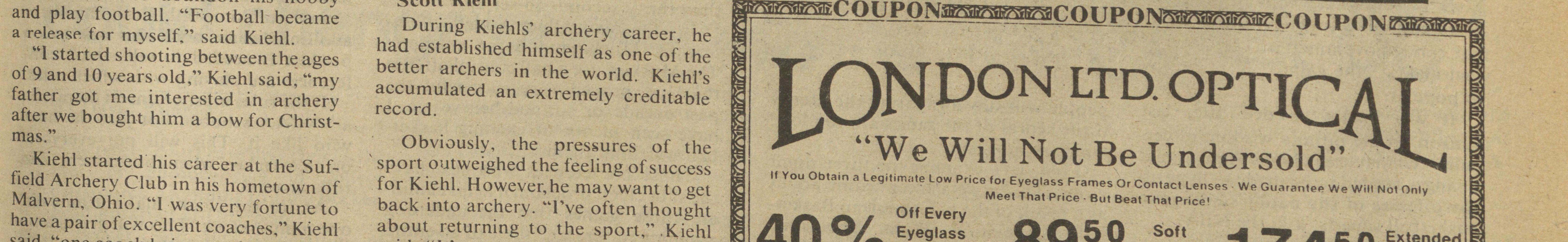 a release for myself." said Kiehl. During Kiehls' archery career, he had established himself as one of the "l started shooting between the ages of 9 and 10 years old," Kiehl said, "my better archers in the world. Kiehl's accumulated an extremely creditable father got me interested in archery record. after we bought him a bow for Christmas." Obviously, the pressures of the Kiehl started his career at the Suf ' sport outweighed the feeling of success