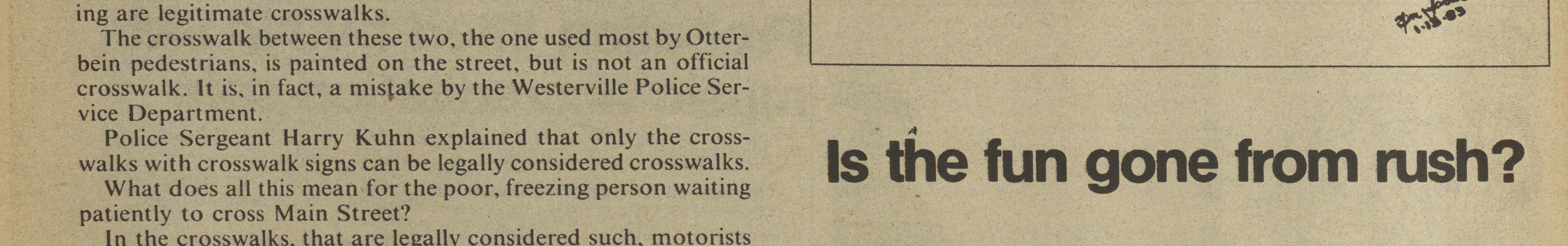 The crosswalk between these two, the one used most by Otterbein pedestrians, is painted on the street, but 1s not an official crosswalk. It is, in fact, a mistake by the Westerville Pohce Service Department.