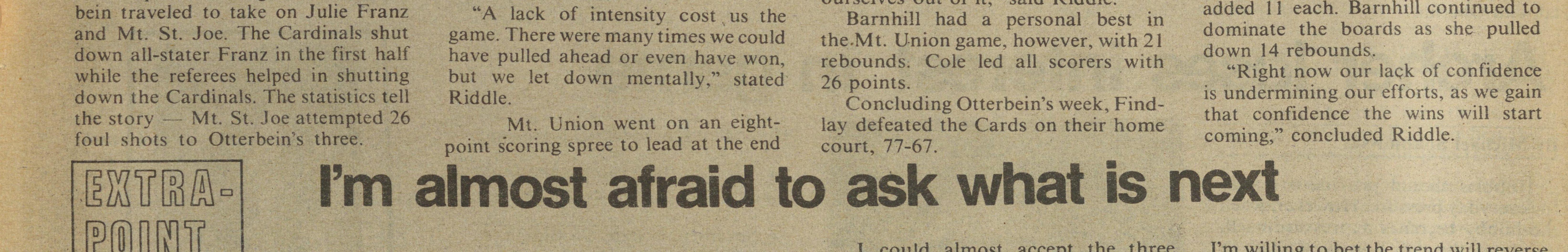 The problems began when Otterbein traveled to take on Julie Franz and Mt. St. Joe. The Cardinals shut down all-stater Franz in the first half while the referees helped in shutting down the Cardinals. The statistics tell the story Mt. St. Joe attempted 26 foul shots to Otterbein' s three.