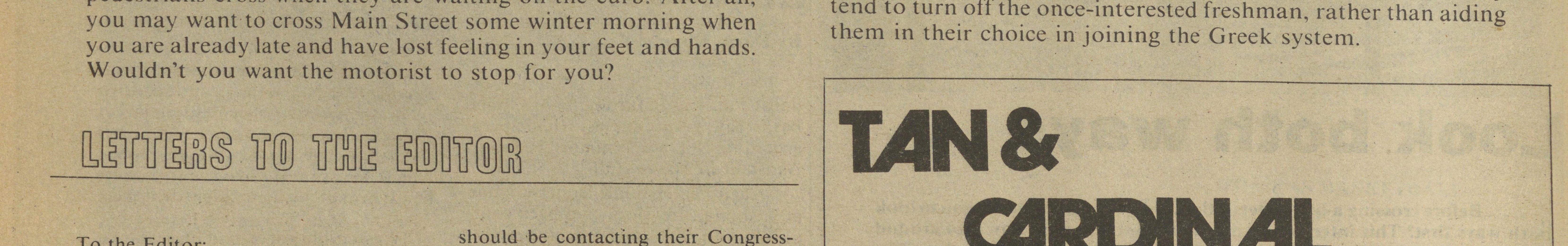 Also, all students, faculty, staff, and administrators should be aware of the situation and be courteous enough to stop and let pedestrians cross when they are waiting on the curb. After all, you may want to cross Main Street some winter morning when you are already late and have lost feeling in your feet and hands. Wouldn't you want the motorist to stop for you?