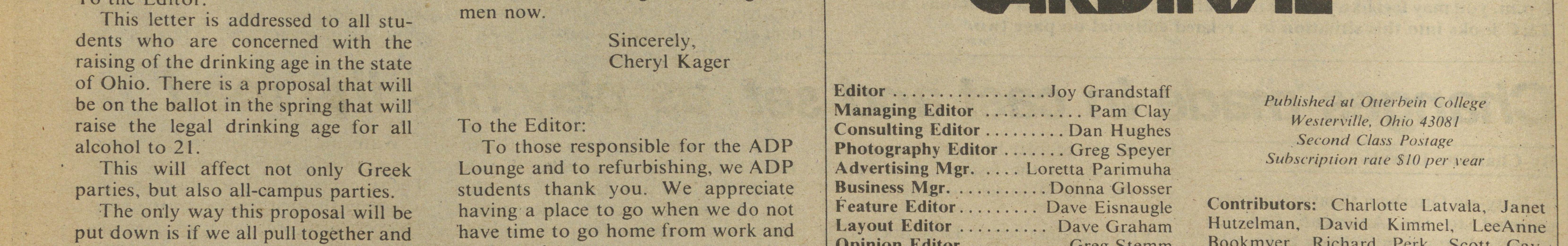 To those responsible for the ADP Lounge and to refurbishing, we ADP students thank you. We appreciate having a place to go when we do not have time to go home from work and back to class.