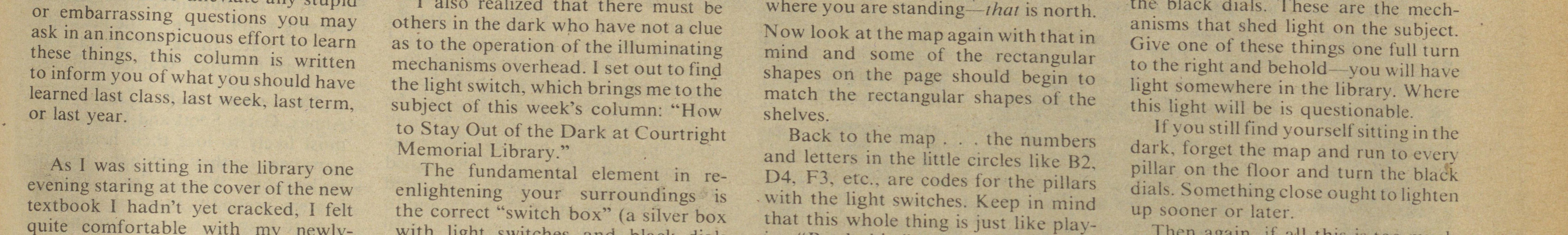 Give one of these things one full turn mind and some of the rectangular these things, this column is written mechanisms overhead. I set out to fins! shapes on the page should begin to to the right and behold you will have to inform you of what you should have the light switch, which brings me to the light somewhere in the library. Where learned last class, last week, last term, match the rectangular shapes of the subject of this week's column: "How shelves. this light w ill be is questionable. or last year. to Stay Out of the Dark at Courtright 1f you still find yourself sitting int he