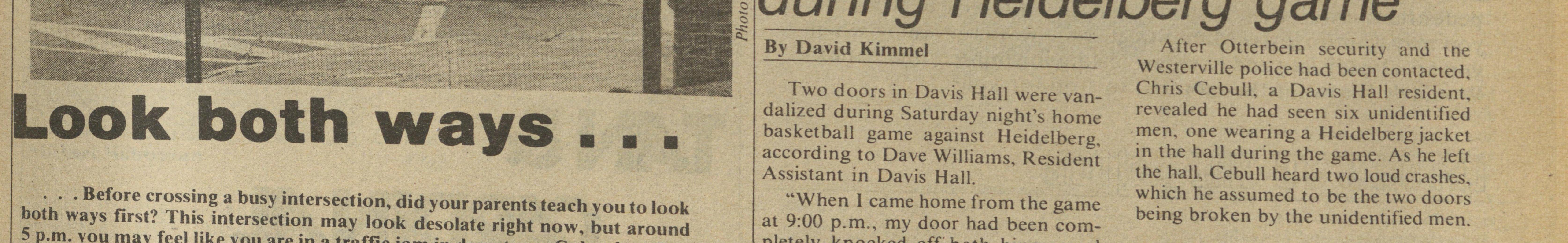 Look both ways • • • basketball game against Heidelberg, men, one wearing a Heidelberg jacket according to Dave Williams, Resident in the hall during the game. As he left Assistant in Davis Hall. the hall, Cebull heard two loud crashes.