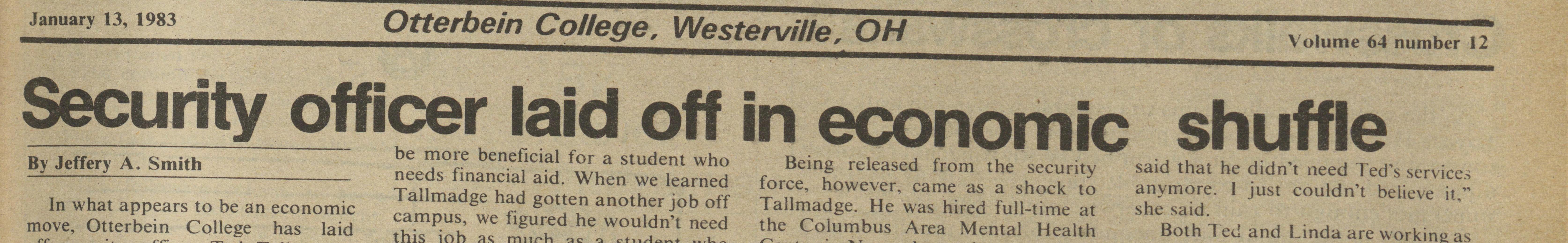 Both 1 ed and Linda are working as off security officer Ted Tallmadge, Center in November and was working much as they can in order for Ted to the weekend officer, and is replacing could use some financial assistance. weekends at Otterbein. He had no remain in school. Tallmadge is major- him wilh a student officer. We will be able to pay the new officer indication that one job would be the either from the work-study or non- ing in business at Otterbein. The move is designed to save Otter cause of losing another.