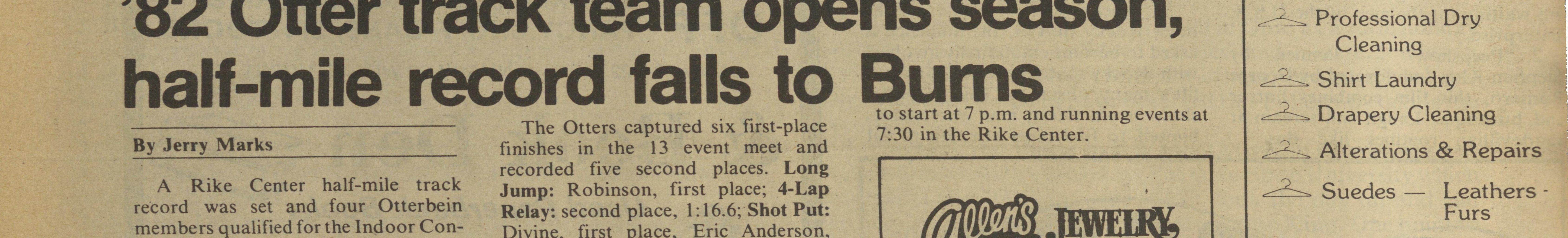 Suedes - Leathers record was set and four Otterbein Relay: second place, l: 16.6; Shot Put: Furs members qualified for the Indoor Con Divine, first place, Eric Anderson, ference Meet at the men's track team junior, second place, 44'1 l"; 50 Yard opening of the year. Dash: Robinson, 5.6 first place; 880