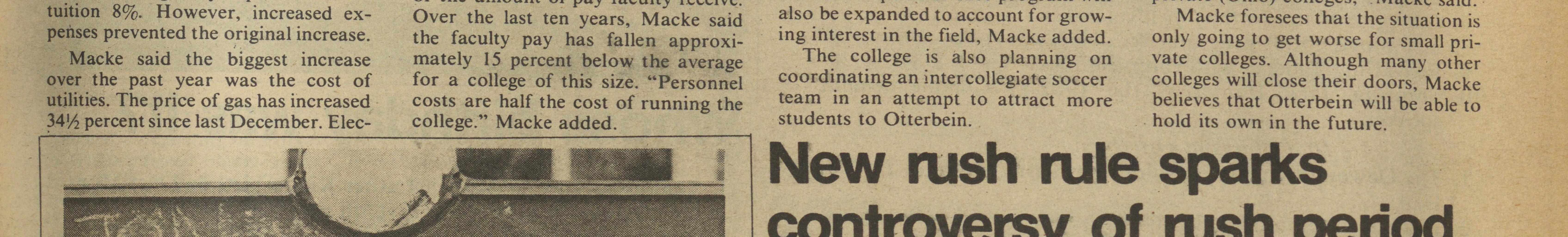 The cost of attending college is no said the college has managed to cut fits to faculty. Prestige and location run, Macke feels these expansions will different from anything else, it's in back on its gas consumption. are some of these benefits that draw pay for themselves. creasing. In addition to increased utility faculty to Otterbein. To offset the tuition increase, the Tuition for the 1983-84 school year costs, the college promised the faculty In addition to pay increases, the college is increasing the financial aid a pay raise. "We committed ourselves college is planning to expand several budget by 13 ½ percent, Macke said will increase by 12 percent according one year ago to an eight percent pay departments. The nursing program Although the college is increasing its to Woodrow R. Macke, vice president will be expanded next year so approxi contribution to financial aid, federal of business affairs - business manager. increase for faculty," Macke said. Over the next five years, the college plans to mately 20 more students can be ad student aid is not expected to increase. The proposed budget was approved by the board of trustees at their meet increase the salary scale comparable mitted to the program. The expansion In comparison with other tuitions ing last Saturday. with other schools of similar size. also calls for two additional faculty around the state, Otterbein compares Otterbein has fallen way behind other members in the nursing department, favorably with schools of similar Macke said the budget sub com colleges of comparable size in terms Macke said. size. "We're ranked 14th out of 17 mittee had originally hoped to increase of the amount of pay faculty receive. The computer science program will private (Ohio) colleges," Macke said. tuition 8%. However, increased ex Over the last ten years, Macke said also be expanded to account for grow Macke foresees that the situation is penses prevented the original increase. the faculty pay has fallen approxi ing interest in the field, Macke added. only going to get worse for small priMacke said the biggest increase mately I 5 percent below the average The college is also planning on vate colleges. Although many other over the past year was the cost of for a college of this size. "Personnel coordinating an intercollegiate soccer colleges will close their doors, Macke utilities. The price of gas has increased costs are half the cost of running the team in an attempt to attract more believes that Otterbein will be able to 34½ percent since last December. Elec- college." Macke added.