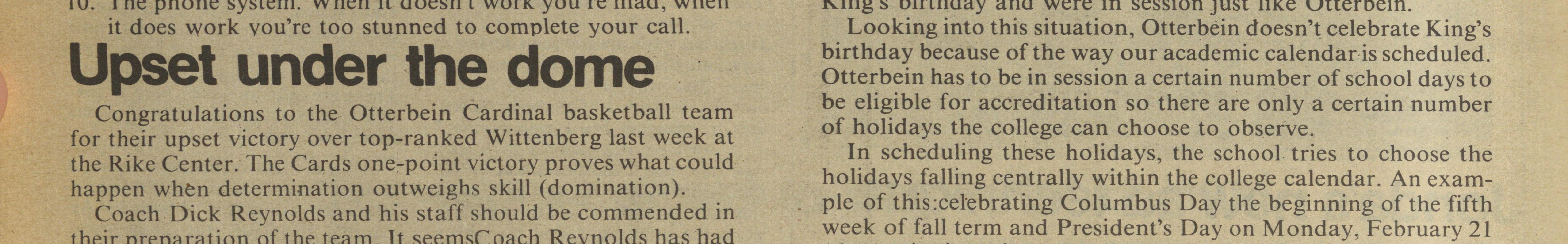 Congratulations to the Otterbein Cardinal basketball team for their upset victory over top-ranked Wittenberg last week at the Rike Center. The Cards one-point victory proves what could happen when determination outweighs skill (domination).