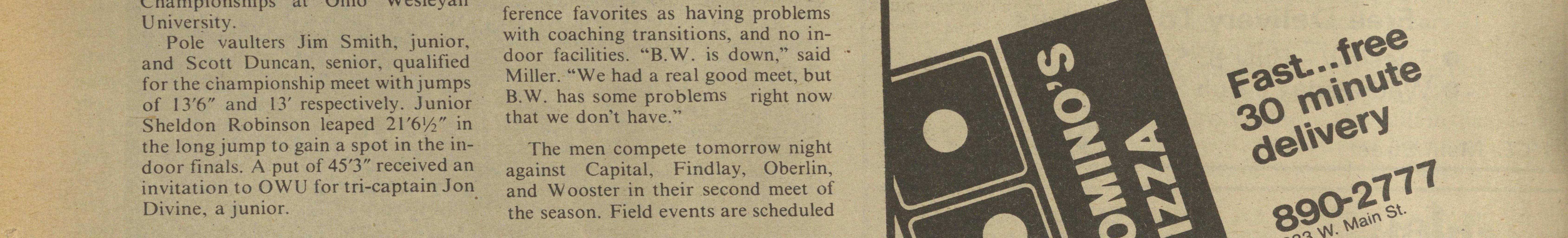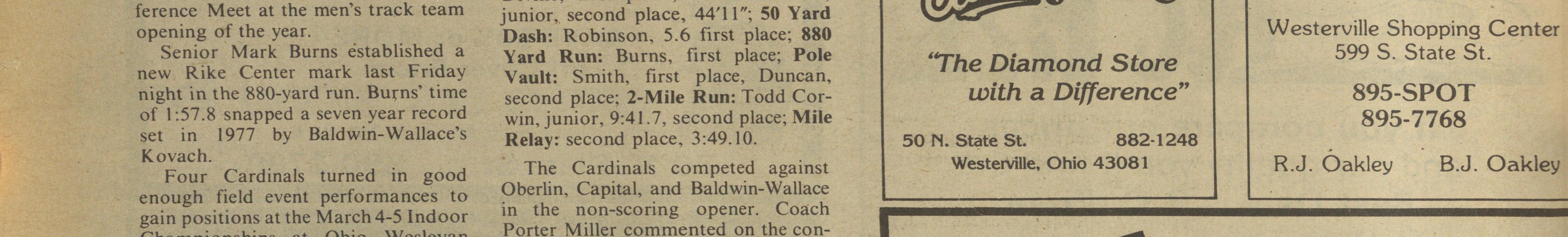 Four Cardinals turned in good Oberlin, Capital, and Baldwin-Wallace enough field event performances to in the non-scoring opener. Coach gain positions at the March 4-5 Indoor Porter Miller commented on the con Championships at Ohio Wesleyan ference favorites as having problems University. with coaching transitions, and no in Pole vaulters Jim Smith, junior, and Scott Duncan, senior, qualified door facilities. "B. W is down," said Miller. "We had a real good meet, but for the championship meet with jumps B.W. has some problems right now of I 3'6" and 13' respectively. Junior that we don't have " Sheldon Robinson leaped 21'6½" in the long jump to gain a spot in the in The men compete tomorrow night door finals. A put of 45'3" received an against Capital, Findlay, Oberlin, invitation to OWU for tri-captain Jon and Wooster in their second meet of Divine, a junior. the season. Field events are scheduled