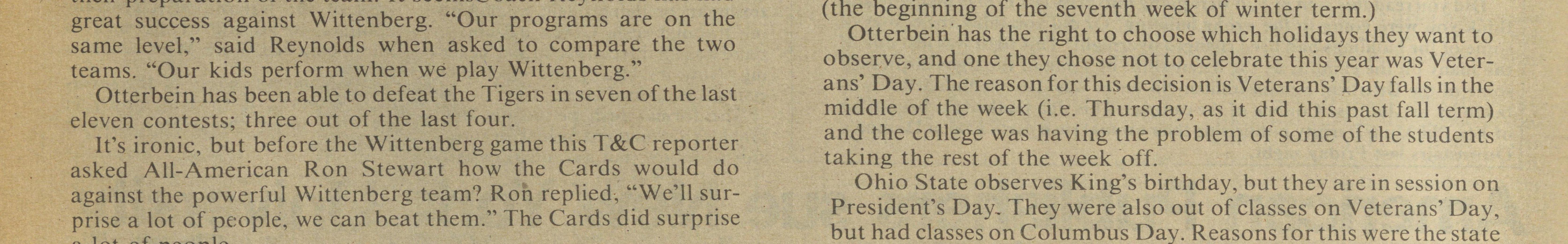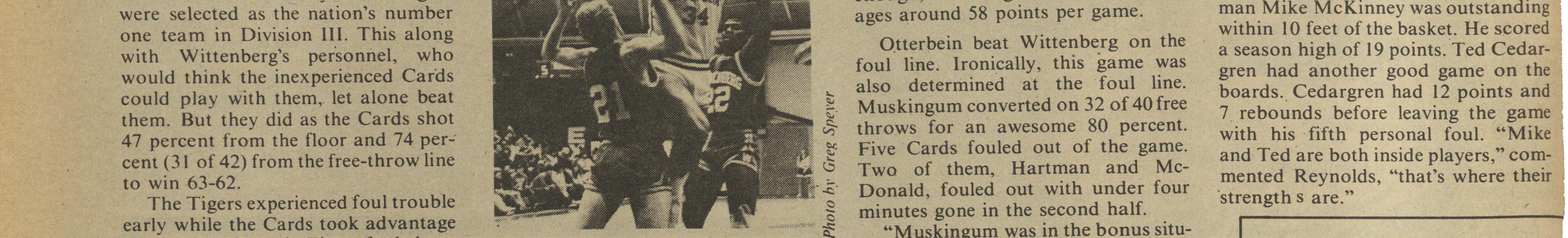 O,tterbein beat Wittenberg on the with Wittenberg's per'sonnel, who a season high of 19 points. Ted Cedarfoul line. Ironically, this game was would think the inexperienced Cards gren had another good game on the could play with them, let alone beat also determined at the foul line. boards Cedargren had 12 points and t Muskingum converted on 32 of 40free 7 rebounds before leaving the game them. But they did as the Cards shot throws for an awesome 80 percent. with his fifth personal foul. "Mike 47 percent from the floor and 74 percent (31 of 42) from the free-throw line