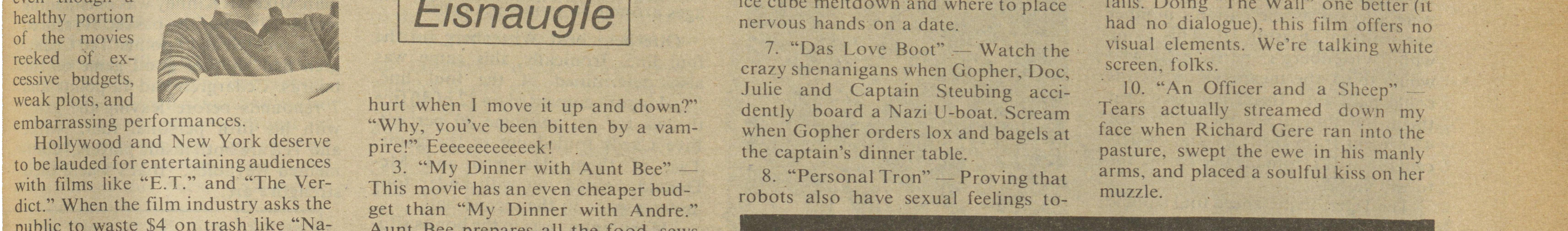 Every year I compile a list of the previous year's worst movies. 1982 was a banner year for cinematic triumphs. even though a healthy portion of the movies reeked of excessive budgets, weak plots, and embarrassing performances. Hollywood and New York deserve to be lauded for entertaining audiences with films like "E.T." and "The Verdict." When the film industry asks the public to waste $4 on trash like "National Lampoon's Class Reunion," then a swift kick to the butt is needed. Bend over movie moguls, here comes my foot!