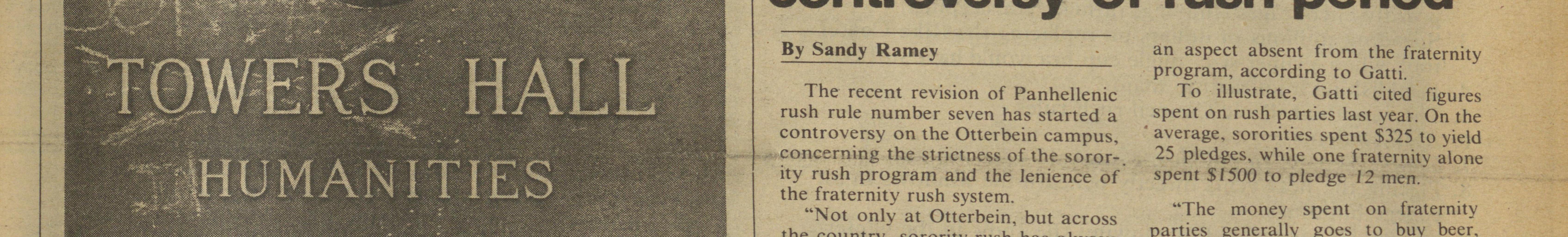The recent revision of Panhellenic To illustrate, Gatti cited figures rush rule number seven has started a spent on rush parties last year. On the controversy on the Otterbein campus, average, sororities spent $325 to yield concerning the strictness of the soror 25 pledges, while one fraternity alone ity rush program and the lenience of spent $1500 to pledge 12 men. the fraternity rush system.