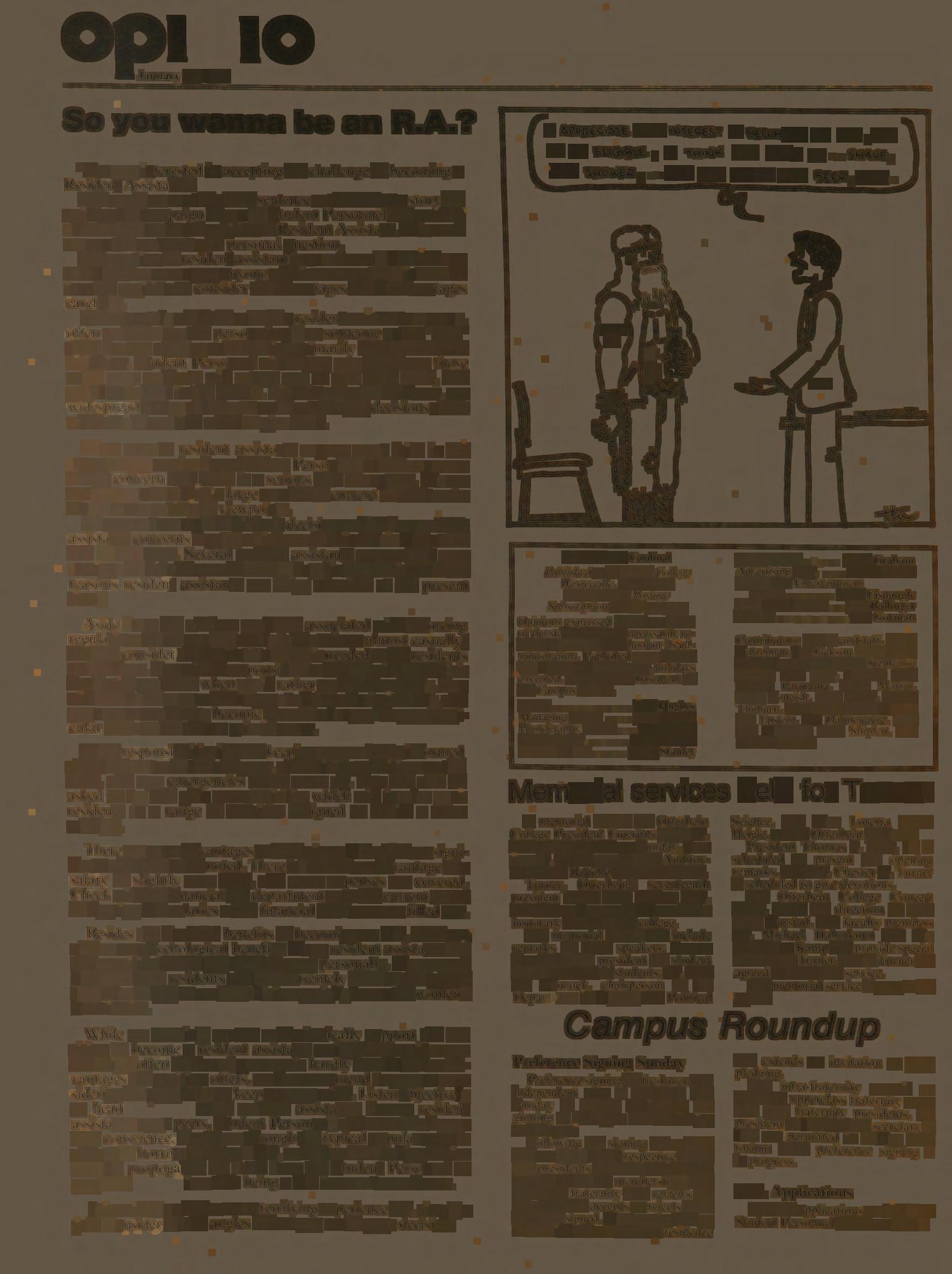 Whi le we certainly cannot enthusiastically support the decision to beco me a resident assistant, mainly because it seems the daily ( oft e n 24 hours) pressure is hardly worth the few advantages the po s ition offers, we do recommend to anyone considering the p oss ibility to keep an open mind . Listen objectively to head resi d e nts, other resident assistants , former resident ass-istants, yo ur peers, Student Personnel, and most of all your own conscience Try to see through the typical popular rumors about the ho r ro r s of being a RA, as well as overlooking the inevitable propoganda set forth from the Student Personnel to persuade pers p ectives that being a RA is an extreme honor.