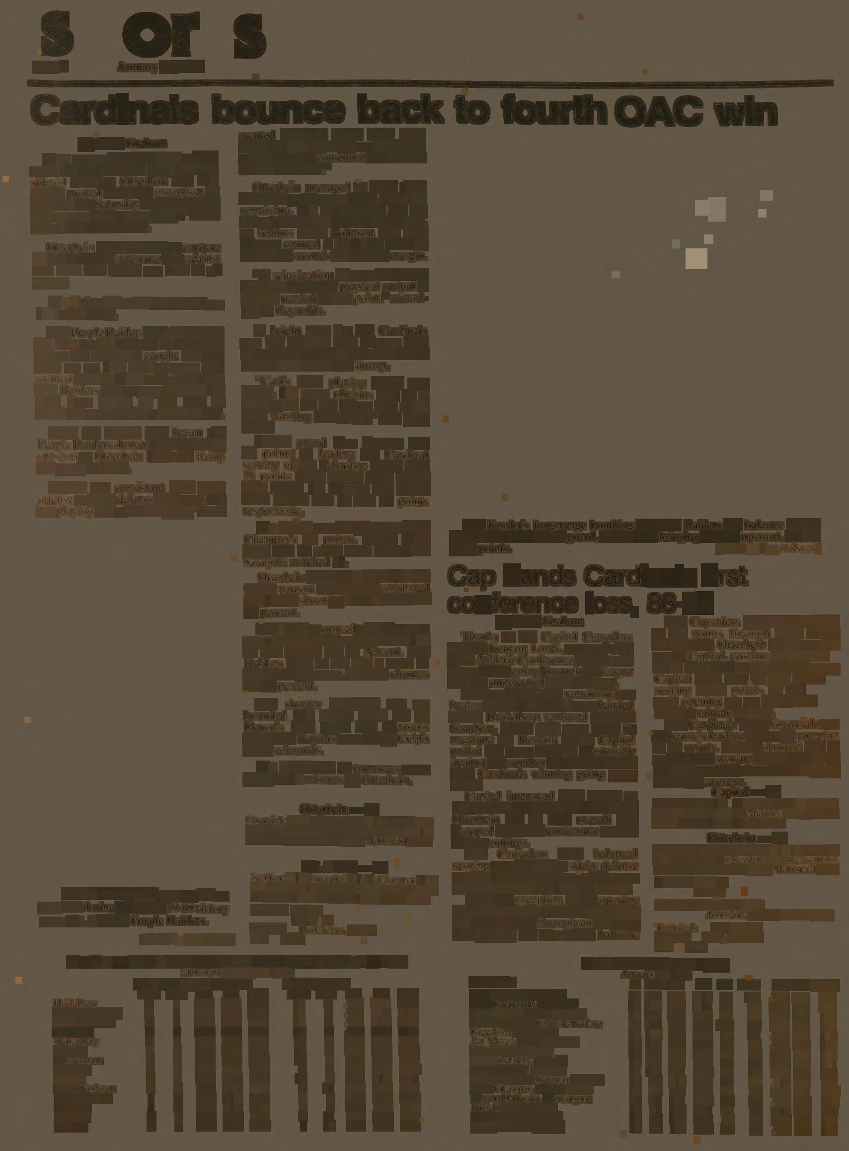 The Crusaders kept leads of eight to ten points through most of the second half. Otterbein made one last run at Capital, coming within four at 69-73 with 4:10 to play in the game. Capital took care. of that threat by scoring seven points to the Cards' one, opening up an 80- 70 lead with under a minute to play.
