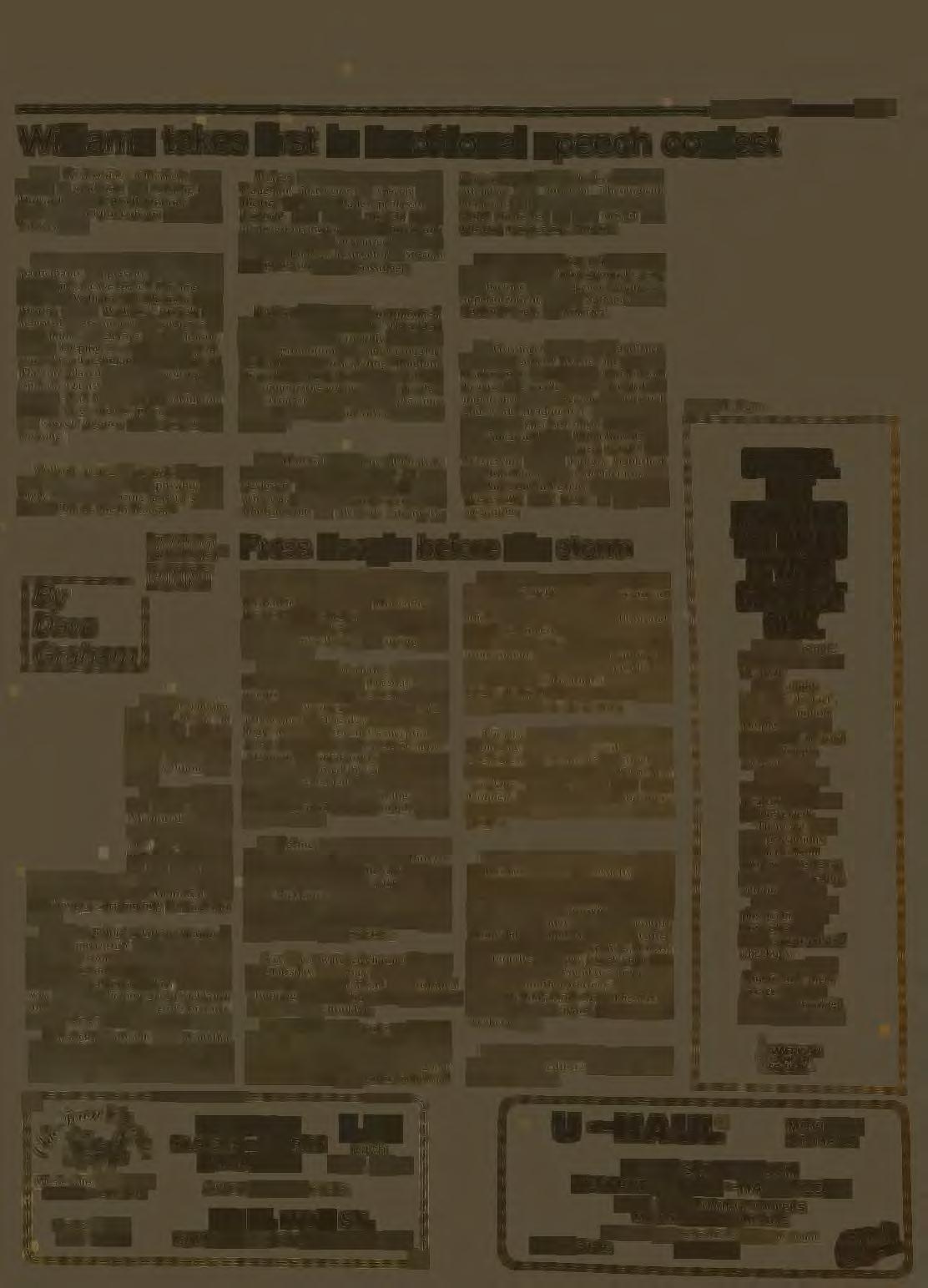 The contest rules called for the three participants to present a six to ten minute persuasive speech. Placing first was Dave Williams, a sophomore from Heath, Ohio. Williams' speech attempted to encourage the audience to help initiate a change in the library hours; keeping it open past 5 p.m. Saturdays. Freshman Mike Hitt, from Dayton, placed second by voicing his opinion against the "up or out rule" of tenure. Ted Oatts, a Worthington adult degree student, placed 3rd with his speech against rent control for housing.