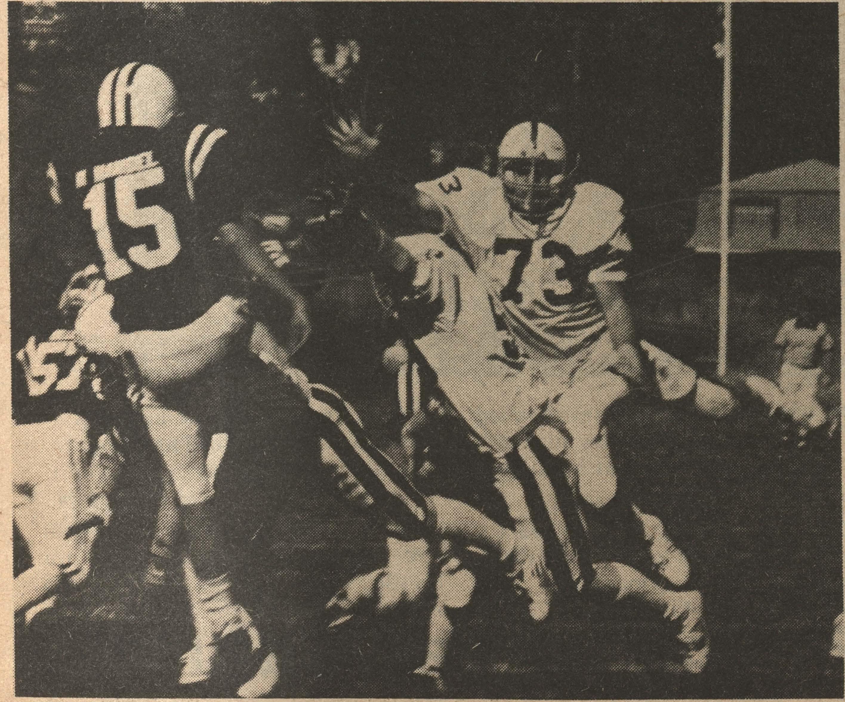 Defensive tackle Jim Grassman (73) dives toward Lord Quarterback Mike Handel. The Cards won the contest with Kenyon 28-20. Photo by