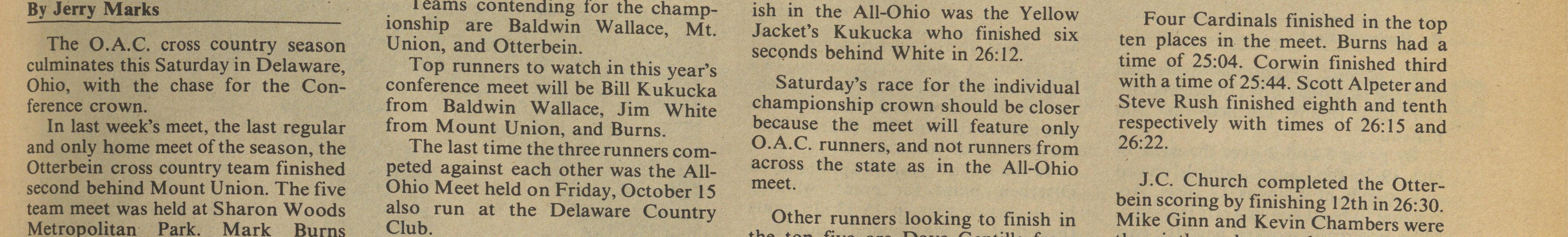 The O.A.C. cross country season Union, and Otterbein. secQnds behind White in 26: 12. ten places in the meet. Burns had a culminates this Saturday in Delaware, Top runners to watch in this year's time of 25:04. Corwin finished third Ohio, with the chase for the Con- conference meet will be Bill Kukucka Saturday's race for the individual with a time of 25:44. Scott Alpeter and ference crown. from Baldwin Wallace, Jim White championship crown should be closer Steve Rush finished eighth and tenth In last week's meet, the last regular from Mount Union, and Burns because the meet will feature only respectively with times of 26: 15 and and only home meet of the season, the The last time the three runners com- O A.C. runners, and not runners from 26:22. Otterbein cross country team finished peted against each other was the All- across the state as in the All-Ohio second behind Mount Union. The five 0 hio Meet held on Friday, October 15 meet. J C. Church completed the Otterbein scoring by finishing 12th in 26:30 team meet was held at Sharon Woods also run at the Delaware Country Other runners looking to finish in Metropolitan Park Mark Burns Club Mike Ginn and Kevin Chambers were the top five are Dave Gentille from the sixth and seventh men for the breezed to victory as the overall In the All-Ohio, Burns ran a time of winner. Otterbein's strong second- 25:19 for the five-mile course. Mount Baldwin Wallace, Todd Corwin from Otters and will participate in the Con- Otterbein, and Chris Creagor from place finish revealed that their chances Union's White, a sophomore business Mount Union. ference Varsity Race on Saturday. for a high finish are better than pre- major from Boston, finished the All-