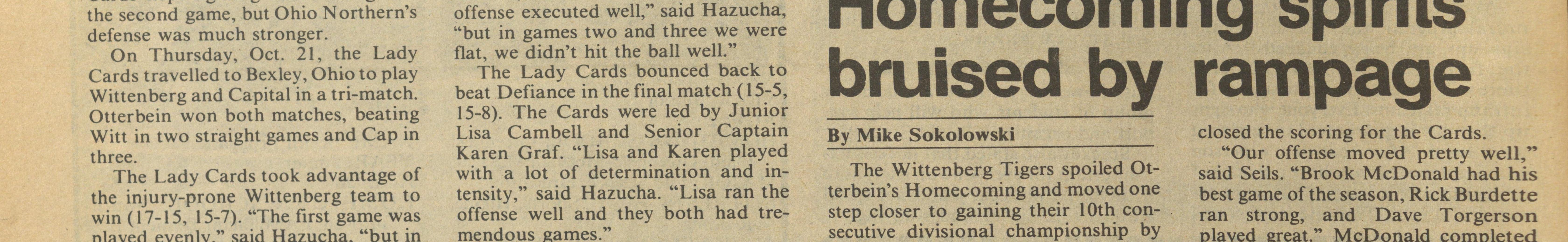 closed the scoring for the Cards. "Our offense moved pretty well," The Wittenberg Tigers spoiled Ot- said Seils. "Brook McDonald had his terbein's Homecoming and moved one best game of the season, Rick Burdette step closer to gaining their I 0th con- ran strong, and Dave Torgerson secutive divisional championship by played great." McDonald completed beating the Otterbein Cardinals 42-6 15 of 29 passes for 193 yards. Burdette in last Saturday's contest. the runners with 34 led Otterbein