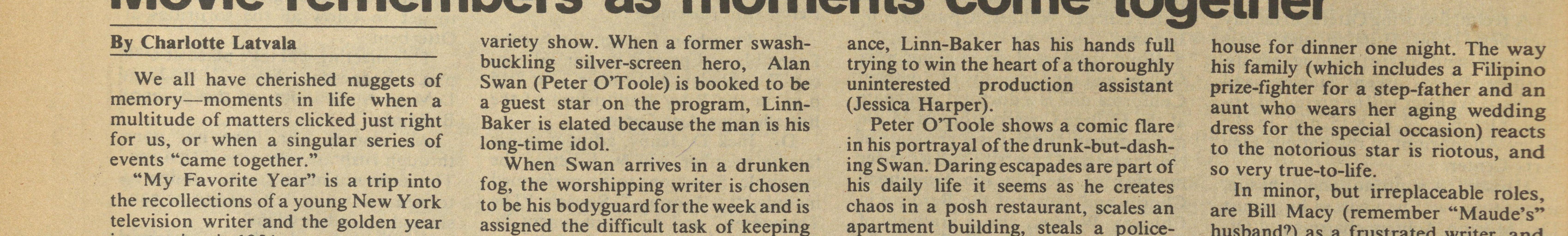 We all have cherished nuggets of Swan (Peter O'Toole) is booked to be uninterested production assistant prize-fighter for a step-father and an memory-moments in life when a a guest star on the program, Linn- (Jessica Harper). aunt who wears her aging wedding multitude of matters clicked just right Baker is elated because the man is his Peter O'Toole shows a comic flare dress for the special occasion) reacts for us, or when a singular series of long-time idol. in his portrayal of the drunk-but-dash- to the notorious star is riotous, and events "came together." When Swan arrives in a drunken ing Swan. Daring escapades are part of so very true-to-life.