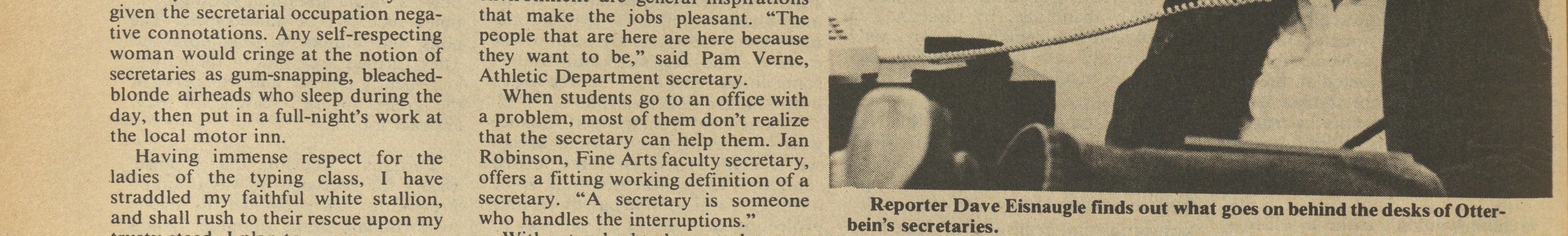 Having immense respect for the Robinson, Fine Arts faculty secretary, ladies of the typing class, I have offers a fitting working definition of a straddled my faithful white stallion, secretary. •• A secretary is someone ReporterDave Eisnaugle finds out what goes on behind the desks of Otter- and shall rush to their rescue upon my who handles the interruptions." bein's secretaries. trusty steed l plan to Without a doubt, the everyday conclear up these stereotypes of tact with students is the most enjoyable rank at the top as the least desirable The importance of the secretary secretaries, and inform the public of part of their job. "The communica- secretarial tasks. should not be taken lightly, since they how important and prestigious these tion with students helps keep you