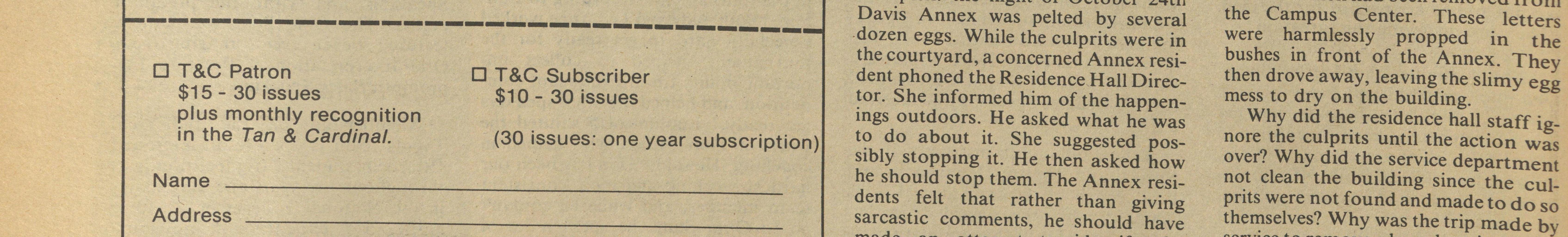Concerning the incidents that took cleaned debris from the courtyard Tan & Cardinal each week. Subscribe today. place October 24 and 25th at Davis including letters spelling HOLLYComplex: the night of October 24th WOOD which had been removed from Davis Annex was pelted by several the Campus Center. These letters -dozen eggs. While the culprits were in were harmlessly propped in the the courtyard, a concerned Annex resi- bushes in front of the Annex. They T&C Patron T&C Subscriber dent phoned the Residence Hall Direc- then drove away, leaving the slimy egg