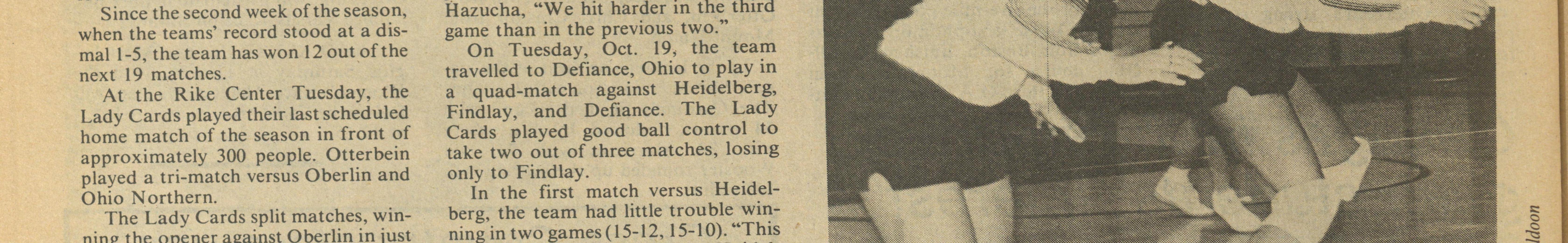 In the night cap against Capital, Otterbein bounced back from a Cap defeat earlier in the season to take two out of three games. In the first game the Lady Cards were down 14-4 until Hazucha called a time-out. Karen Graf came back to serve 14 straight points to win the game 16-14. "That was the best Karen has served in her
