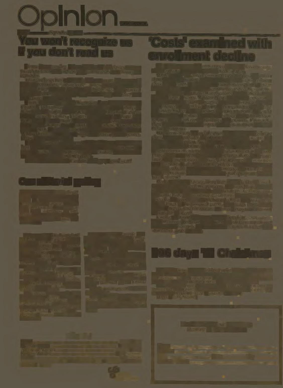 Perhaps the most far-reaching effects of this falling in enrollment will be upon academic programs. We would hope that thi s 1s not the case. If the lack of numbers dictates budget-tightening , we would hope that academic departments be dealt with mo s t liberally. We could live, as mentioned above, with fewer light bulbs, fewer CPB-sponsored events, even fewer pages in the T &C. However, fewer instructors or fewer library sources would be difficult to accept.