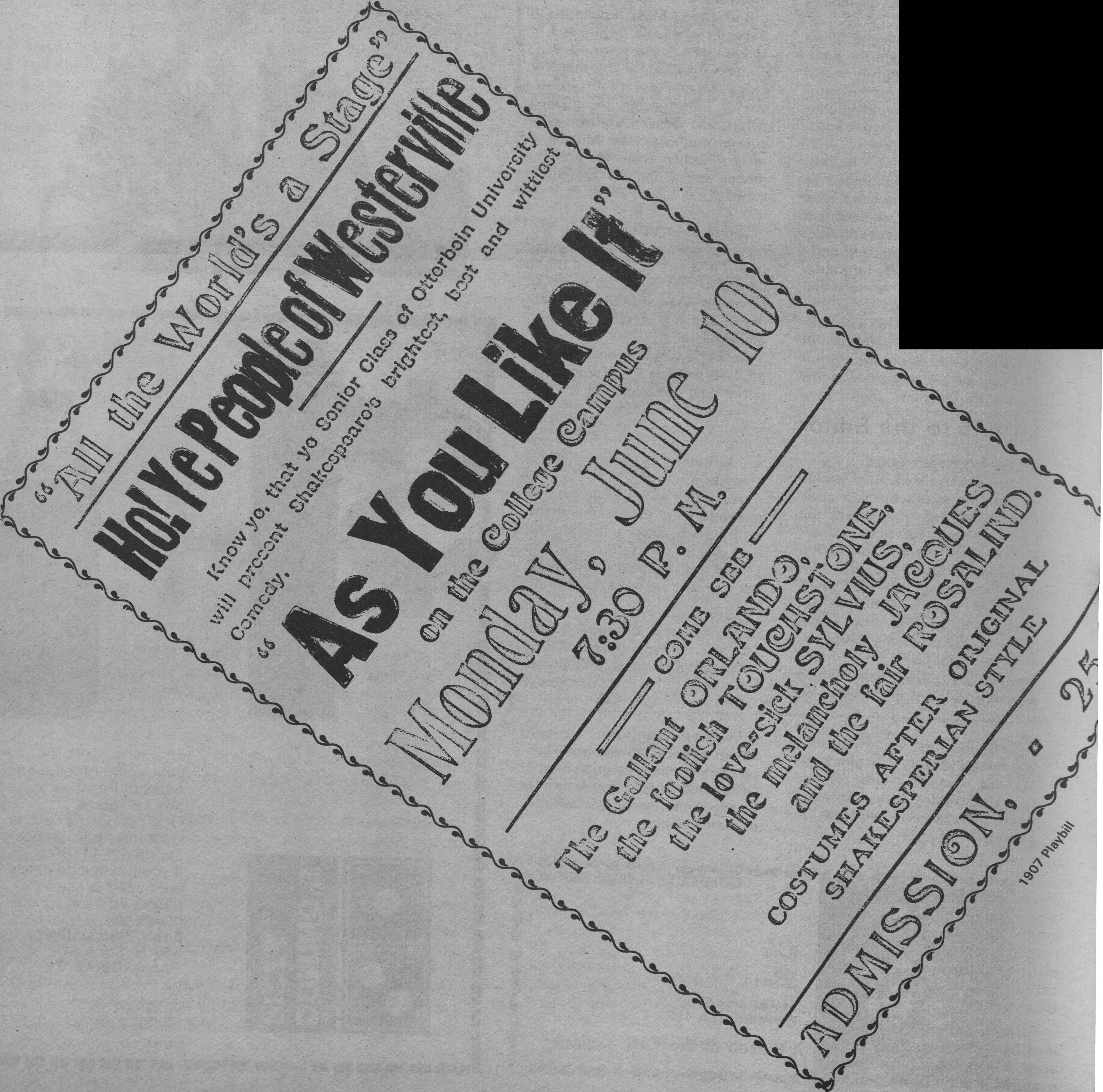 The William Shakespeare play Shakespeare's "As You Like It", but to every character in the play. is something with its theme of love, was chosen special, though. The rendition was excel/em and "Like It" was the first complete to be the first play. the class is to be congratulated, major production ever given at It was an open-air performance, while Prof. Evans is deserving the Otterbein The date was June 10, under the direction of Professor highest mention for his sacrifice _ 1907. Edwin B. Evans, and sponsored by and interest.