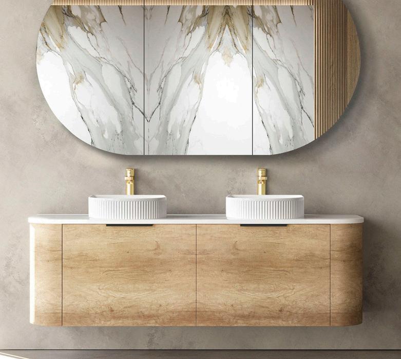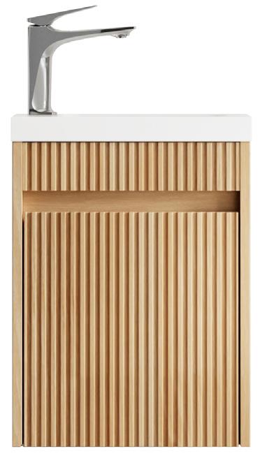 The Byron Fluted vanity features a woodland oak natural timber look finish, high moisture resistant plywood construction, soft edge finger pull handles, and Hettich hinges and runners for smooth and soft closing. The new Fluted veneer showcases detailed fine lines that add elegance to you designer bathroom.