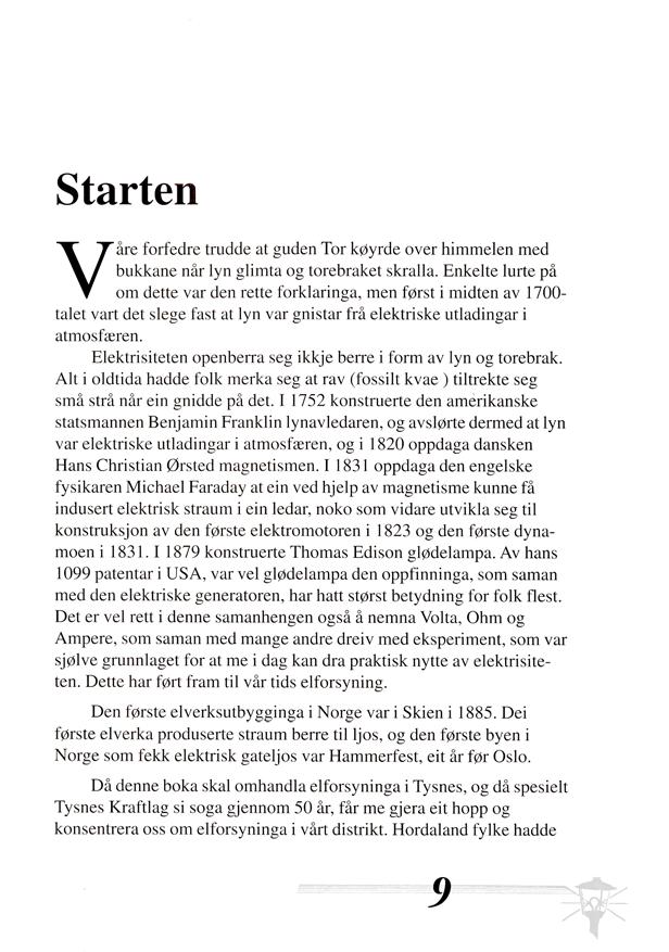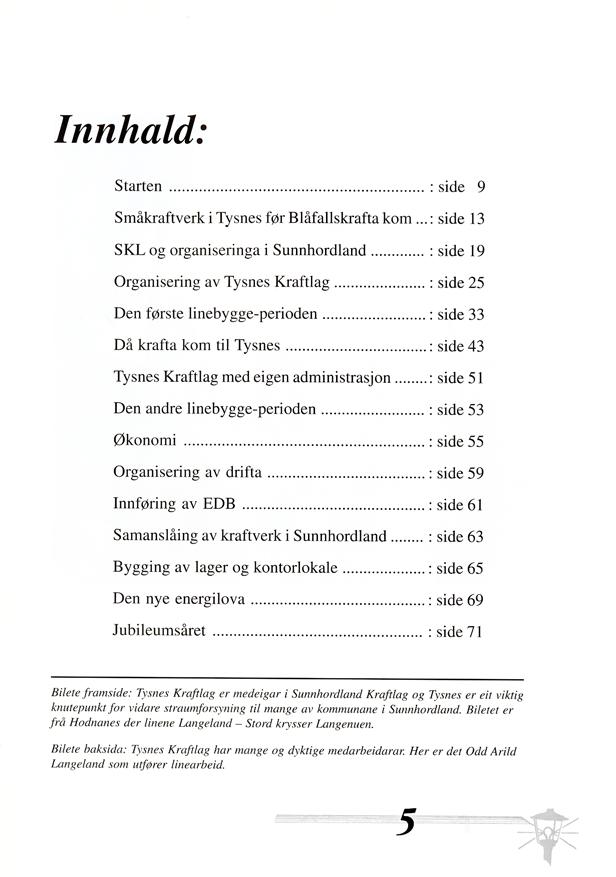 Boka er bygd opp slik at ho tek lesaren med gjennom utviklinga til Tysnes Kraftlag – frå etableringa og fram til i dag. Me har valt å ta med eit opptrykk av historia om dei fyrste 50 åra som del éin av boka, og har engasjert Sveinung Økland til å skriva ein ny del om dei siste 30 åra. Gjennom historiske tilbakeblikk, viktige vegval og personlege forteljingar ønskjer me å gi eit heilskapleg bilete av korleis kraftlaget har utvikla seg, og kva rolle det har spela i lokalsamfunnet.