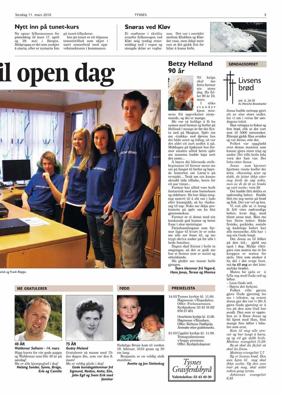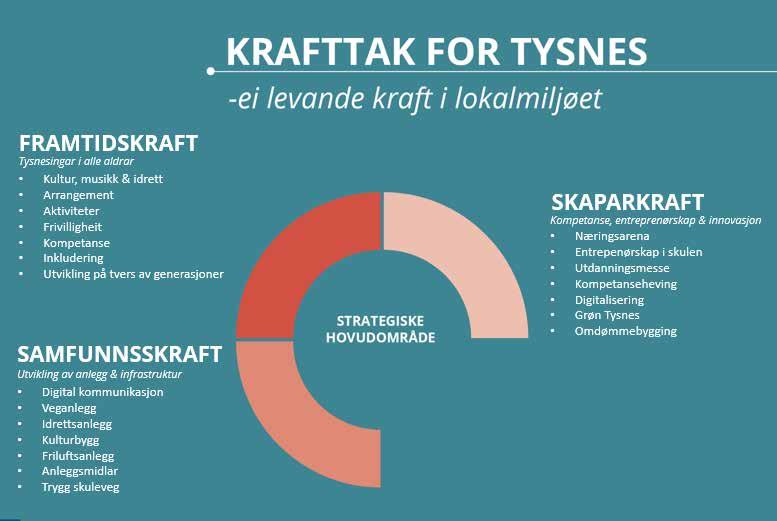 Eg ønskjer at me skal bidra til å vere framsynte ved å sjå moglegheitene, samstundes som me bringer fram alt det me har fått til i lokalsamfunnet vårt. Framsnakk er eit godt ord. Me må framheva alt det me faktisk får til, ikkje minst for at dei unge skal sjå at Tysnes er ein god plass å bu når ein er ferdig utdanna og skal etablera seg.