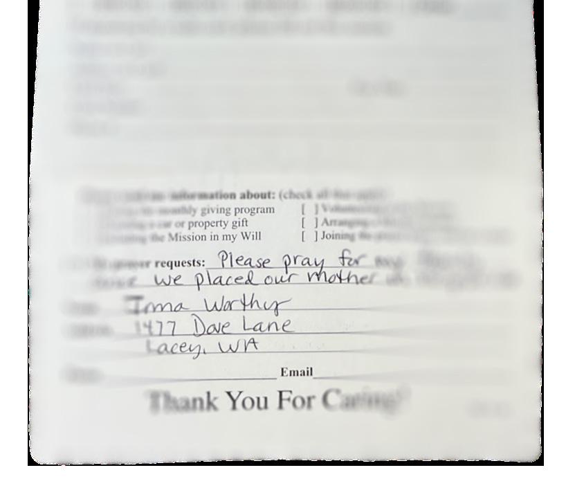 Our staff meets weekly to give updates on what is occurring in the various programs. One of the meeting highlights is to distribute the prayer requests we receive from donors asking us to pray for them. Topics range from salvation for family members, strength to endure a trial, and to prayer for health and healing for themselves or family members. We are honored and humbled to be entrusted with such heartfelt issues to take before the Lord. In an average month, we receive more than twenty prayer requests.
