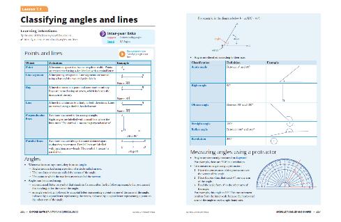 • Students will require access to a straight edge or ruler and a pair of compasses to complete some questions. An angle is formed anywhere that two lines meet. Introduce the terms an arm and a vertex. Different-sized angles have different names. From smallest to largest they are acute, right, obtuse, straight, reflex and revolution. Give an example of each type of angle and arrange the angles in order. Show students how to measure each angle with a protractor and label the size of each angle in the example.